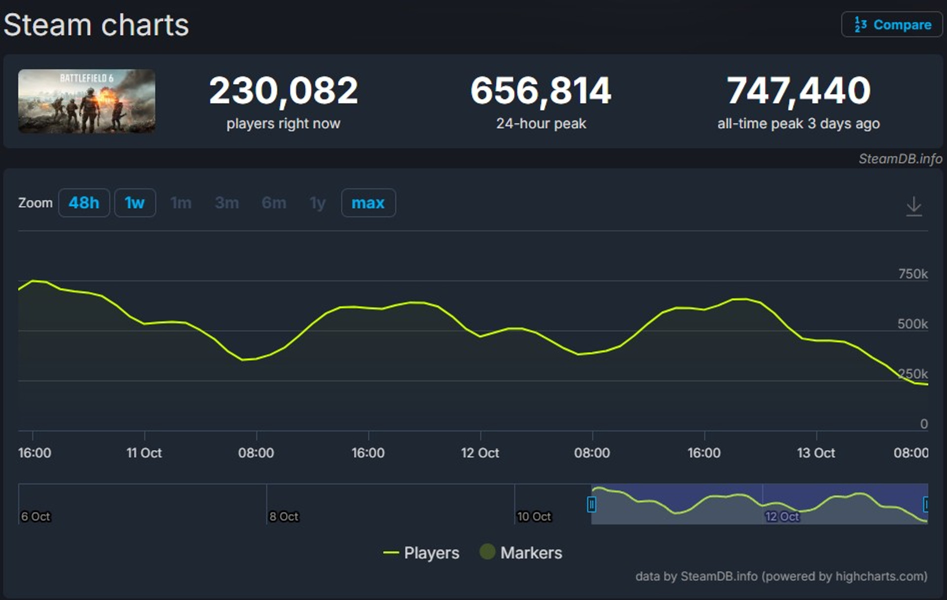 Battlefield 6 офіційно вийшла 10 жовтня і вже в перші години встановила рекорд франшизи: 747 440 одночасних гравців на Steam. Це зробило її другою найпопулярнішою грою платформи після Counter-Strike 2. Це також перевищило попередній рекорд Call of Duty у 491 670 гравців і вивело Battlefield 6 у топ-15 найпопулярніших ігор в історії Steam.